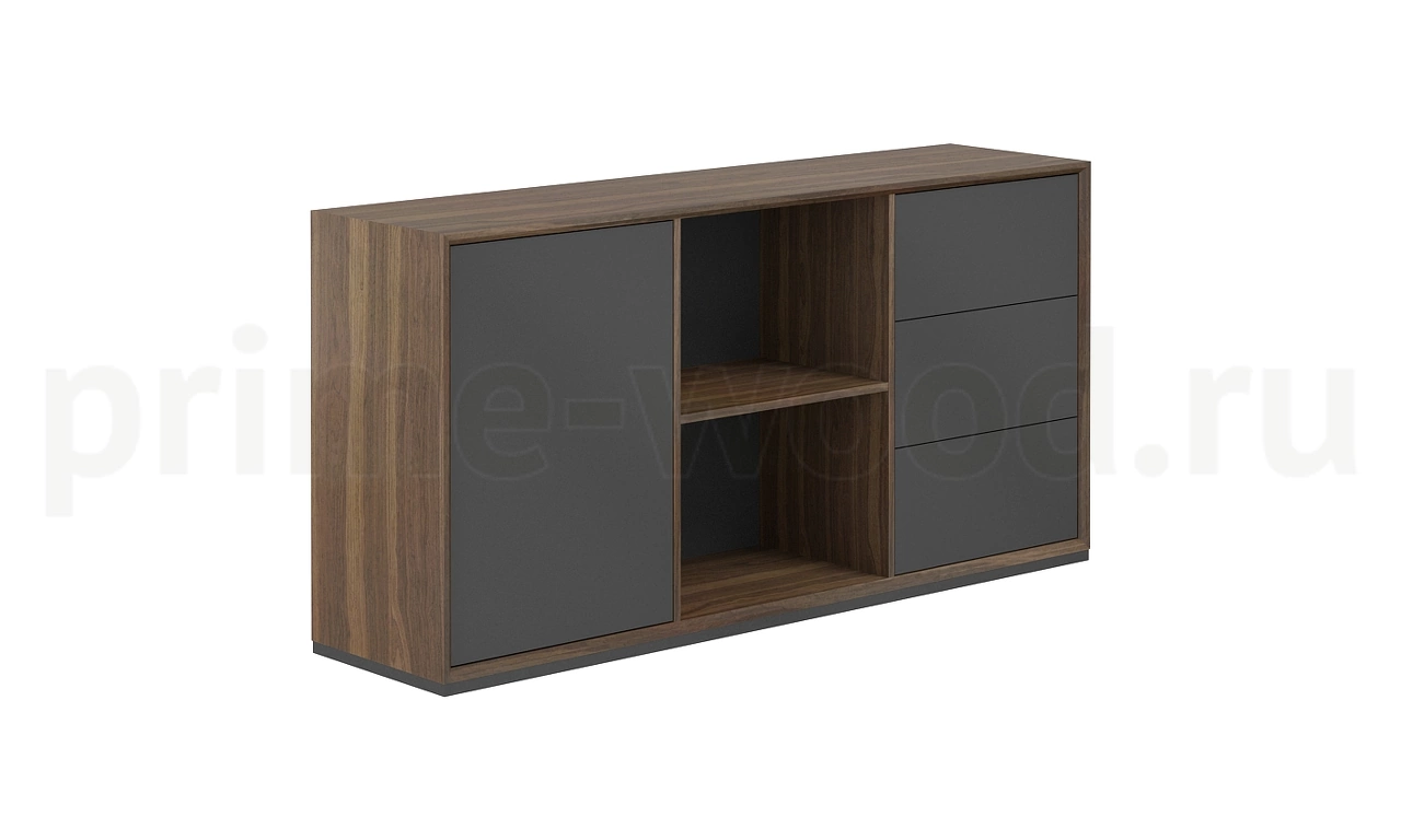 Греденция разделяется на 3 секции. Левая секция с глухой дверью. Правая - 3 выдвижных ящика. Центральная секция открытая.