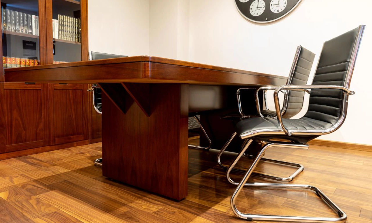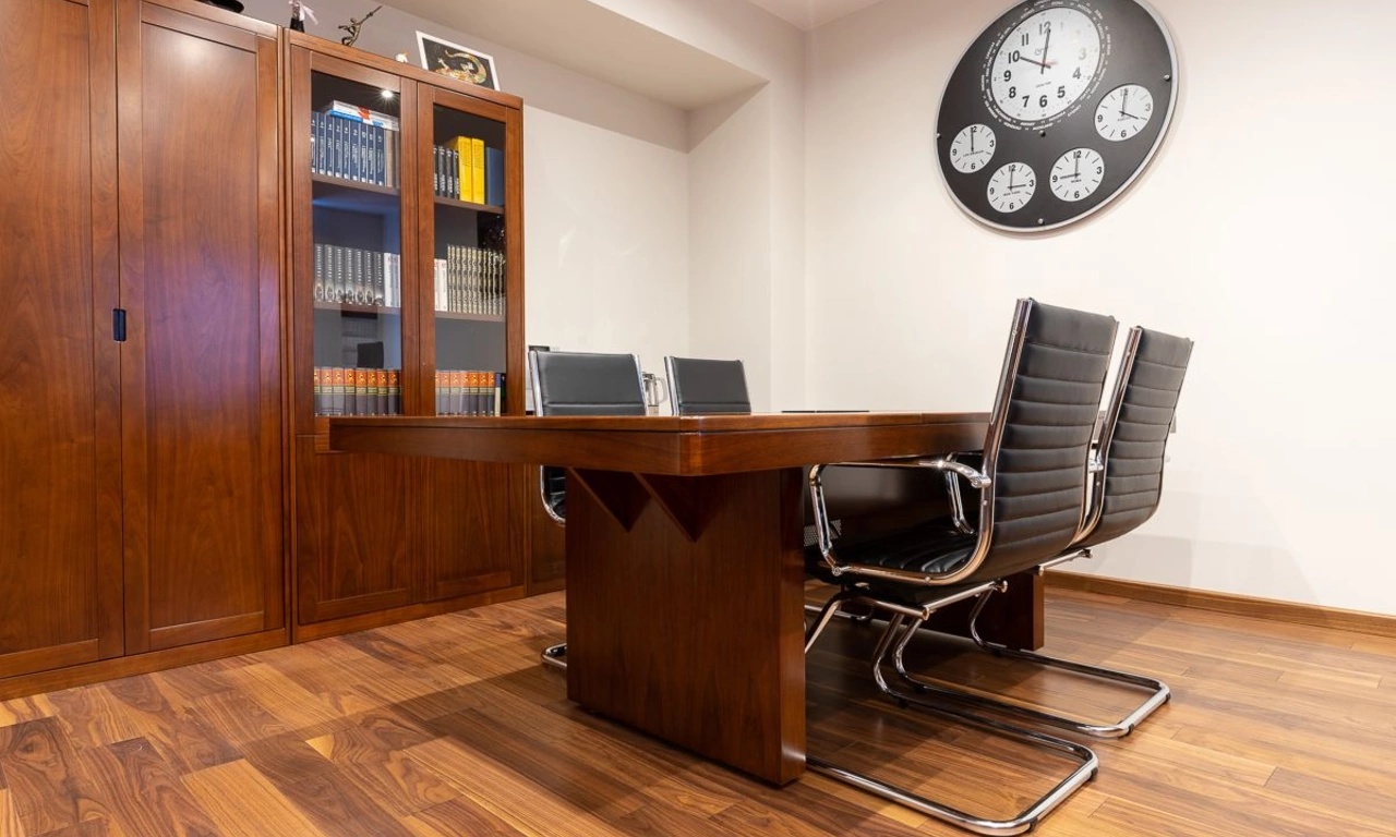 Недавно мы закончили проект по обустройству кабинета одного из руководителей компании. Работа началась с дизайн-проекта и плана расстановки мебели. В просторном помещении предстояло разместить большой рабочий стол, стол для переговоров на 4ых, зону хранения с гардеробом и найти место для кофемашины и холодильника.