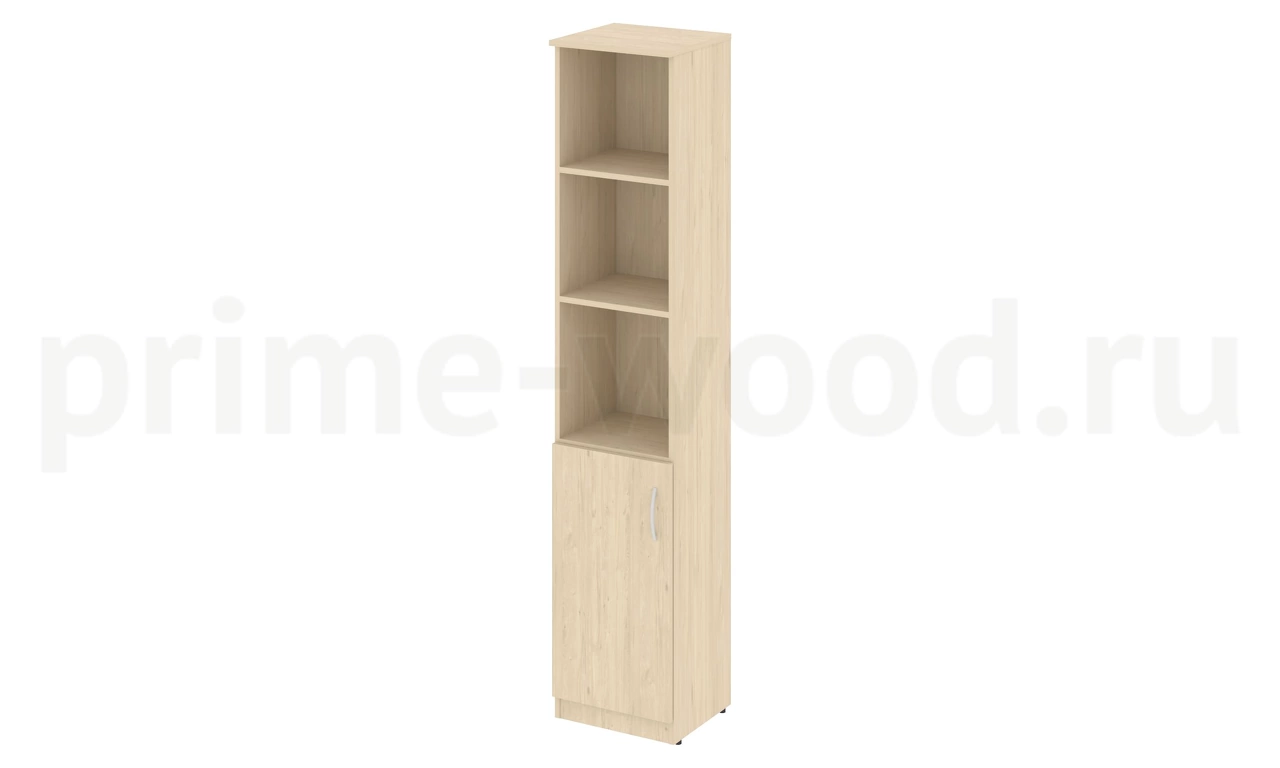 Шкаф высокий узкий (1 низкая дверь ЛДСП) левый отличается эргономичной конструкцией, имеет компактные размеры: 38.8х35.9х191 см. Мебель изготавливается из ЛДСП. В нижней части – закрытое дверкой отделение, в верхней – три открытых полки. Ручка алюминиевая. Доступные цвета: «Бук Артизан», «Венге», «Орех Гварнери». Шкаф высокий узкий подходит к Каркасу антресоли узкой В.А-1